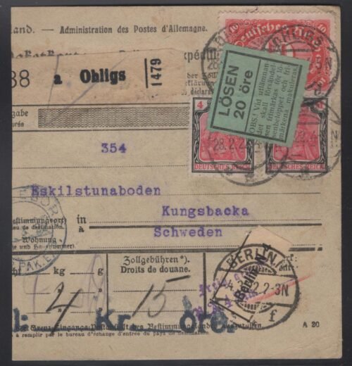 Deutsches Reich MI 180 (2), 195, 196 (7) Nachnahme packet card stamps on both sides 18 8 22 VF