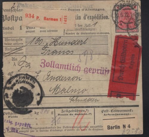 Deutsches Reich MI 196 (9), 153 paket card Barman 10 6 22 VF