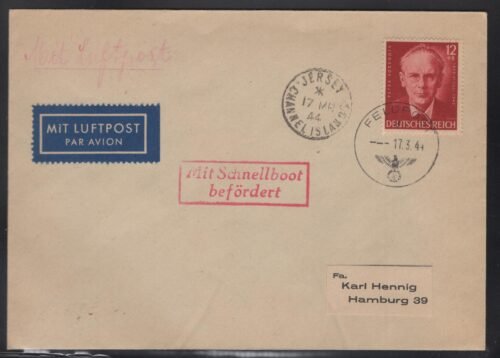 Channel Islands franked Ger MI 856 Hennig cover “Mit Schnellbaot befordert” red stamp cancelled Feldpost 17.3.41 VF