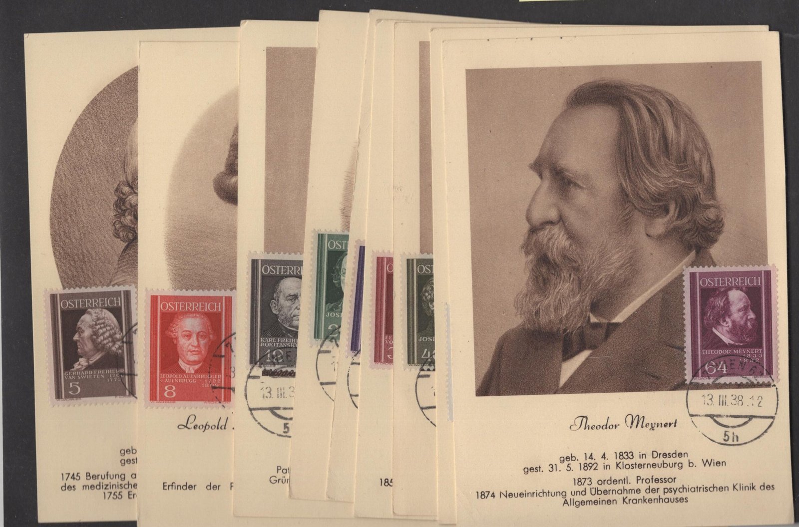 Austria MI 649-57 on 9 separate unaddressed picture cards of the physicians on the stamps VF
