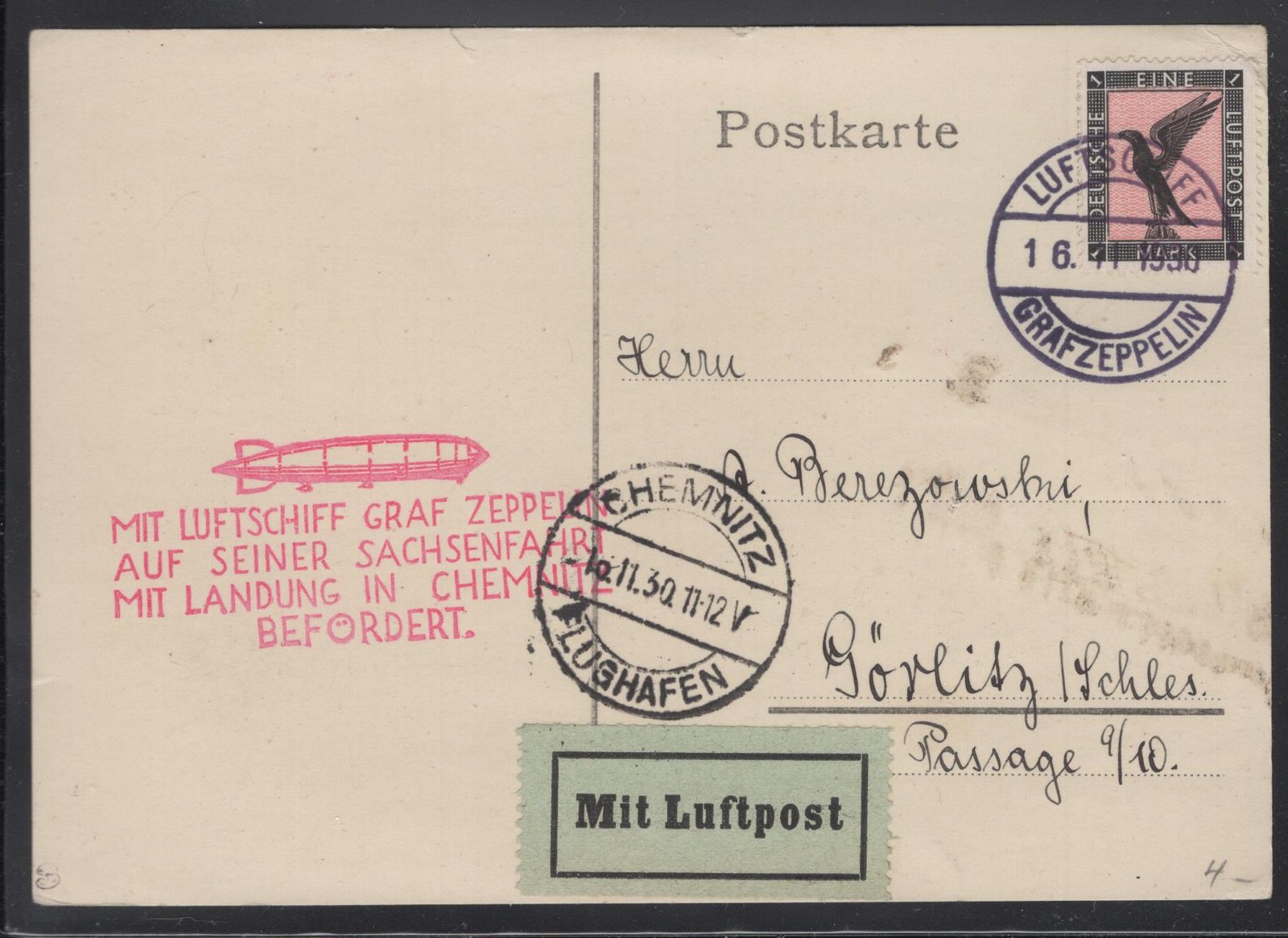 Deutsches reichGraf zeppelin post card 16 11 1930 -landing in Chemnitz F/VF