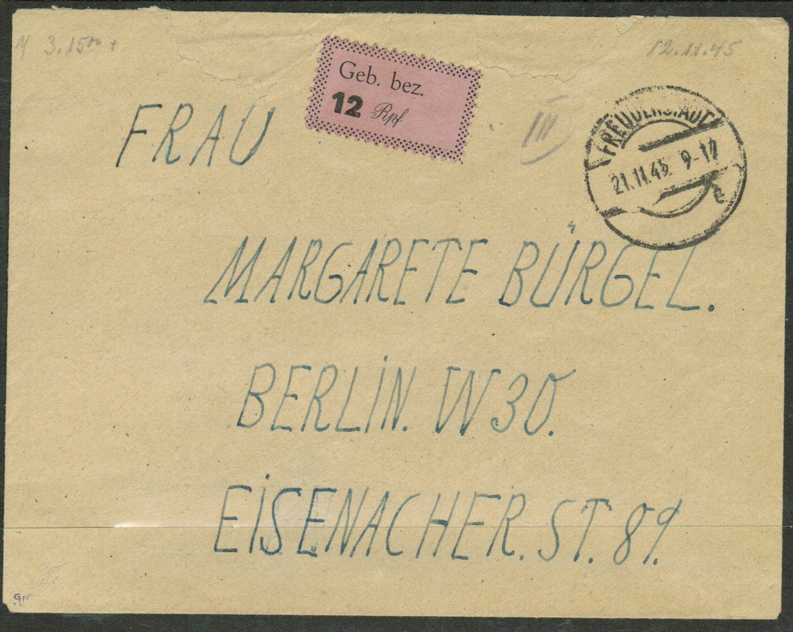 Germany Post WWII Locals Freudenstadt Michel#: 3 on cover G/VG