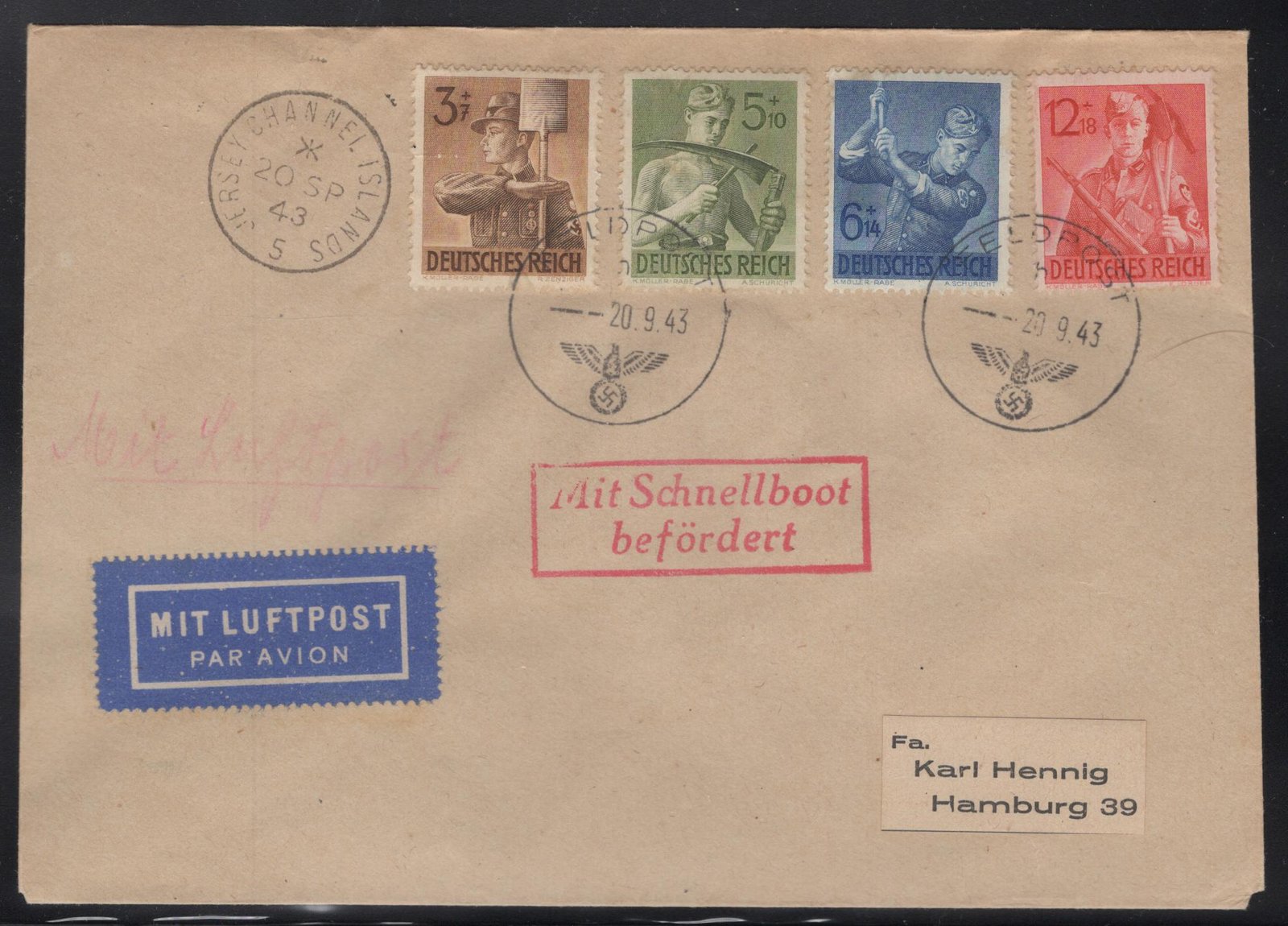 Jersey cover Ger 850-3 cancelled FELDPOST 20.8.43 f/vf with red stamps "Mit Schnellboot befordert" quantity