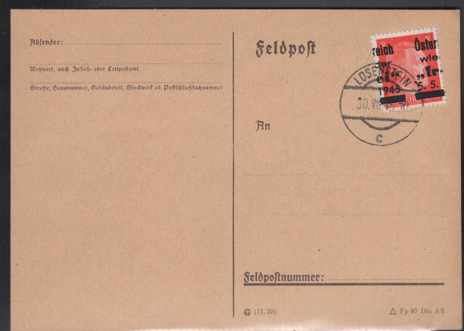 Losenstein Soecknick 6 8 pf stamp with major overprint shift to right on unaddressed post card 30 VII 45 VF certificate quantity