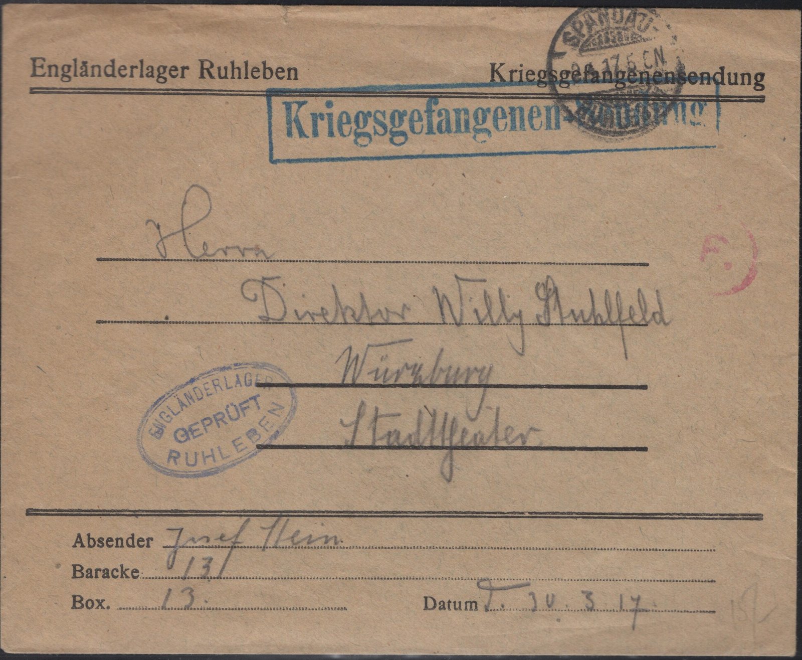 Ruhleben Lagerpost letter to Wurzburg 30 3 17 VF