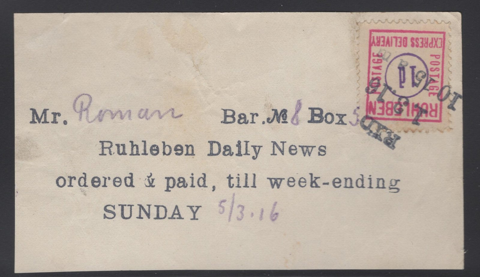 Ruhleben Lagerpost local post newspaper order receipt franked with MI 9 F/VF quantity