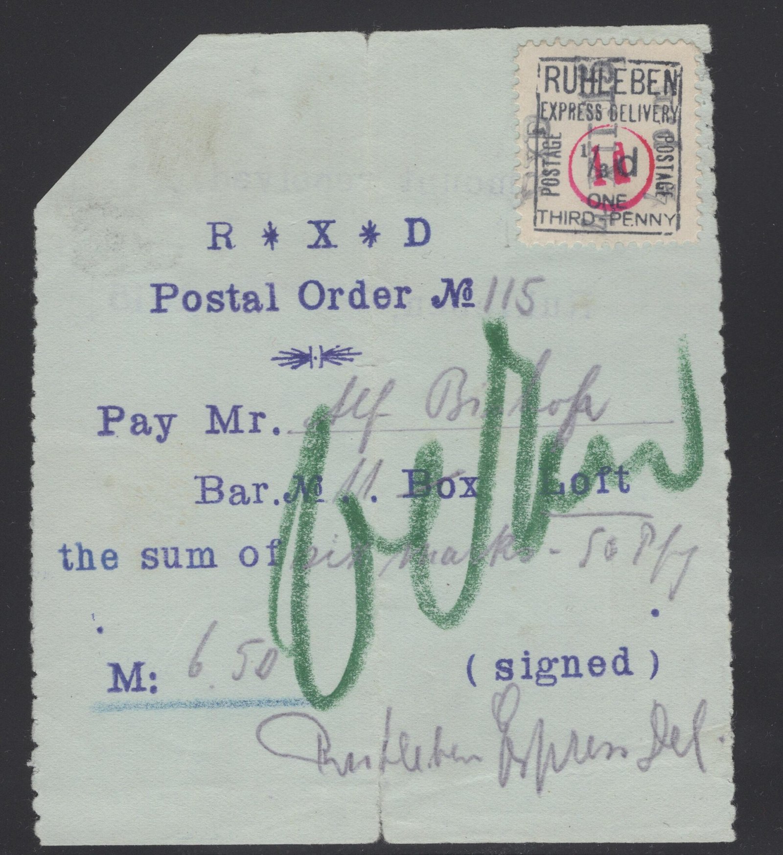 Ruhleben Lagerpost postal money orde franked with MI 1 VG