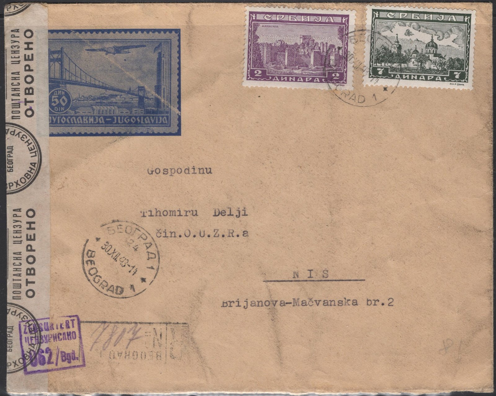 Serbia MI 75, 78 postally used censored cover F/VF