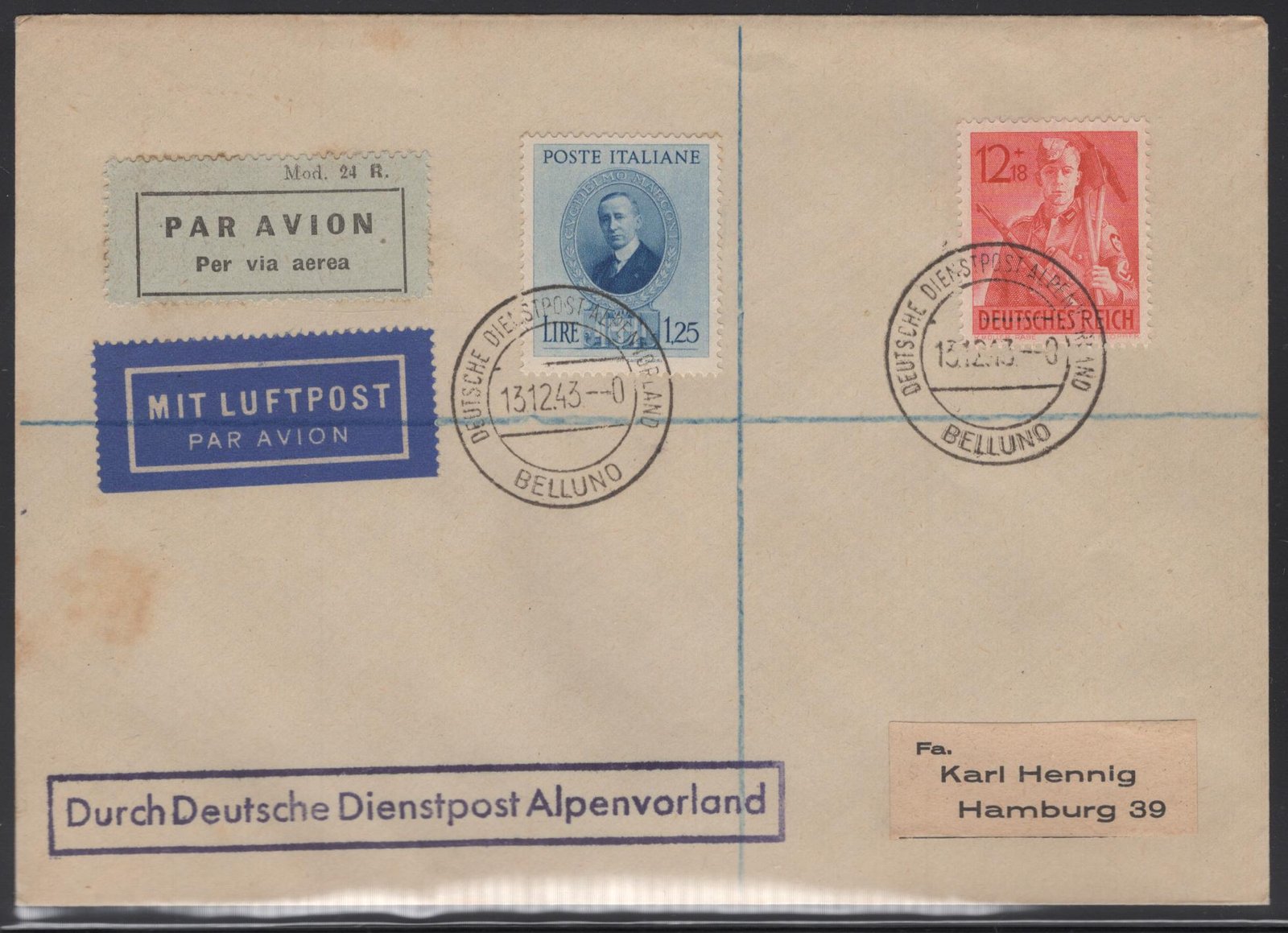 Sudetenland - Alpenvorland Dienstpost - Hennig cover franked with Ger and Italy stamps canceled Belluno 13.12.43 VF quantity